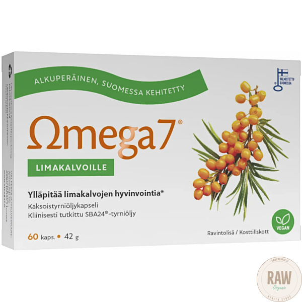 Suomen suosituin tyrniöljyvalmiste jo vuodesta 1997. Alkuperäinen ja kliinisesti tutkittu Ωmega7 SBA24®-kaksoistyrniöljykapseli limakalvojen luonnolliseen kosteutukseen. Ainutlaatuinen SBA24®-kaksoistyrniöljy sisältää sekä tyrnin marja- että siemenöljyä. Näin saadaan limakalvoille ja iholle tärkeitä omega-3, -6, -7 ja -9 -rasvahappoja optimaalisessa suhteessa. SBA24®-tyrniöljyn riittävät ja vakioidut A- ja E-vitamiinitasot takaavat tuotteen toimivuuden. Kehomme valmistaa tyrniöljyn beetakaroteenista A-vitamiinia, joka ylläpitää limakalvojen ja ihon hyvinvointia. E-vitamiini suojaa soluja oksidatiiviselta stressiltä.* Suomessa kehitetyn ja valmistetun SBA24®-tyrniöljyn terveysvaikutuksia on tutkittu useissa tieteellisissä tutkimuksissa.