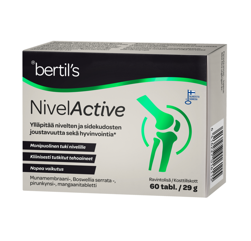 - Bertils Health NivelActive 60 tabl. tarjoaa monipuolisen yhdistelmän huolella valittuja ainesosia, jotka tukevat aktiivista elämäntapaa.