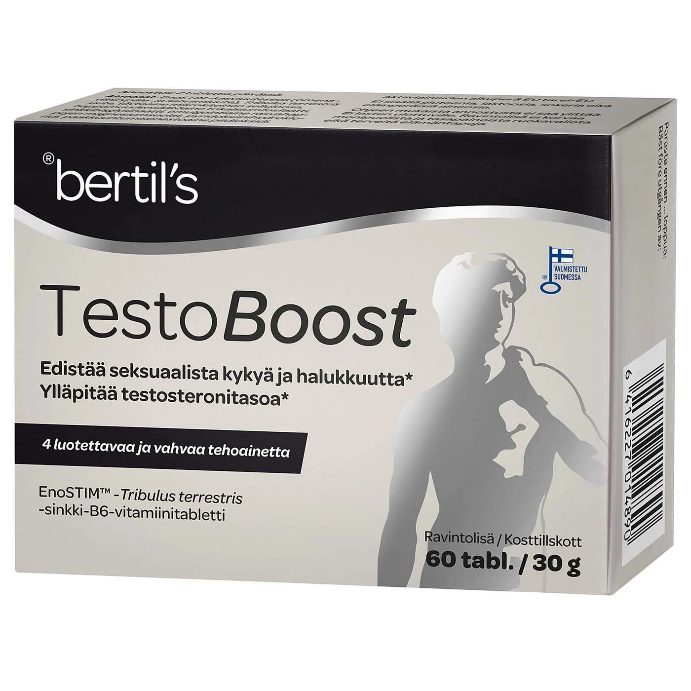 Monipuolinen valmiste miehille. Bertil’s Testo Boost sisältää EnoSTIM kasviuuteseosta, Tribulus terrestris -uutetta, sinkkiä ja B6-vitamiinia. Tribulus terrestris tukee seksuaalista kykyä ja halukkuutta. Sinkki edistää veren testosteronitasojen pysymistä normaaleina. B6-vitamiini edistää normaalia hermoston toimintaa, normaaleja psykologisia toimintoja sekä vähentää väsymystä ja uupumusta. Tabletti, jonka monipuolinen koostumus on laadittu erityisesti miehistä hyvinvointia ajatellen. Kehitetty ja valmistettu Suomessa. Gluteeniton, laktoositon ja sokeriton. Ei sisällä eläinperäisiä ainesosia. Ravintolisä.