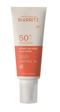 Laboratoires de Biarritz Sun Spray SPF50+ -aurinkosuojasuihke antaa välittömän suojan UVA/UVB-säteilyä vastaan luonnollisten mineraalisuojafilttereiden avulla. Lisäksi patentoitu Alga-Gorria® -punaleväuute ehkäisee ihon ennenaikaista ikääntymistä. Sopii käytettäväksi kasvojen ja vartalon iholla.