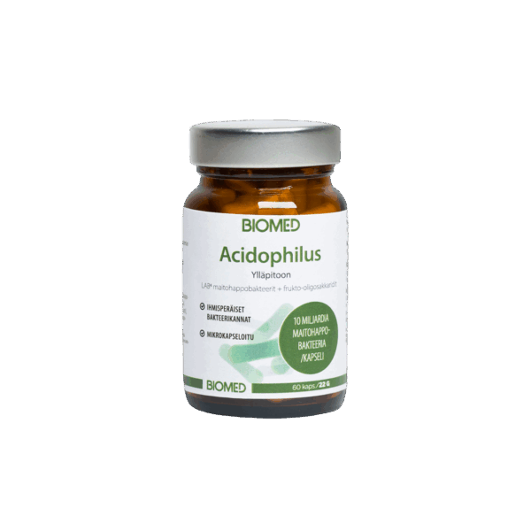 Biomed Acidophilus 60 kaps. on korkealaatuinen probioottivalmiste, joka sisältää 60 kapselia. Tämä tuote on suunniteltu tukemaan suoliston terveyttä ja vahvistamaan immuunijärjestelmää.Probiootit ovat hyödyllisiä bakteereja, jotka auttavat ylläpitämään suoliston tasapainoa ja edistävät ruoansulatusta. Biomed Acidophilus sisältää erityisesti Lactobacillus acidophilus -kantaa, joka on yksi suosituimmista probioottikannoista.Tämä tuote on erityisen hyödyllinen henkilöille, joilla on ruoansulatusongelmia, kuten ilmavaivoja, ummetusta tai ripulia. Se voi myös auttaa vahvistamaan immuunijärjestelmää ja ehkäisemään infektioita.Biomed Acidophilus on valmistettu korkealaatuisista raaka-aineista ja se on täysin luonnollinen. Kapselit ovat helppoja niellä ja ne voidaan ottaa aterian yhteydessä tai ilman.Suositeltu annostus on yksi kapseli päivässä. Tämä pakkaus sisältää 60 kapselia, joten se riittää kahden kuukauden käyttöön.Tilaa Biomed Acidophilus 60 kaps. tänään ja anna suolistollesi terveellinen boosti!