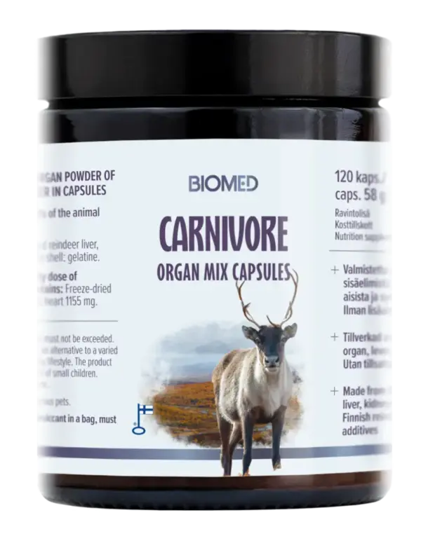 Eläinkunnan ravintorikkaimmat osat kätevässä muodossa. Valmistettu suomalaisen poron sisäelimistä – maksasta, munuaisista ja sydämestä. Luonnollinen ja ravintoainerikas lisä monipuolistamaan ruokavaliota!