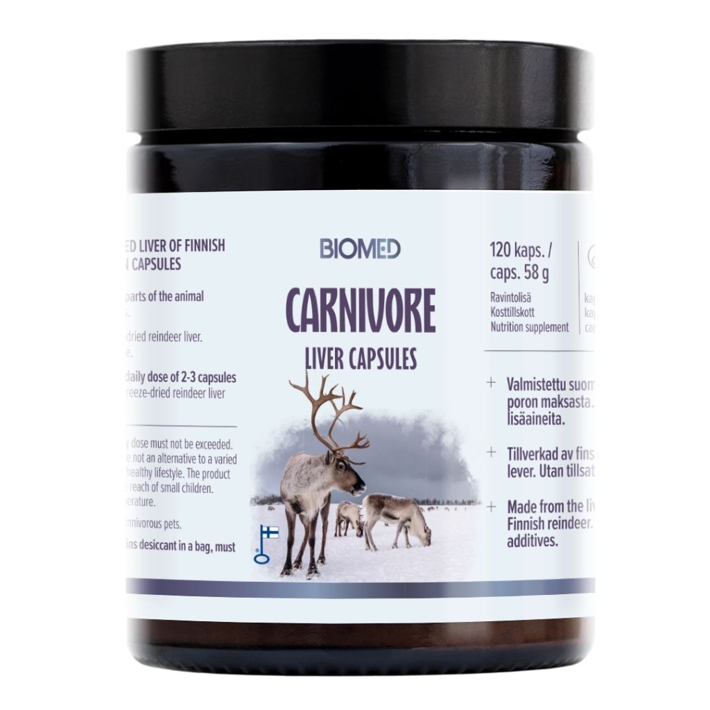 Biomed Carnivore Poronmaksakapselit tarjoavat perinteisen, ravintorikkaan tavan tukea kehon hyvinvointia modernissa ja helpossa muodossa. Tuote sisältää pakastekuivattua suomalaista poron maksaa, joka on yksi luonnon ravinteikkaimmista elinperäisistä ravinnonlähteistä. Maksassa on luonnostaan runsaasti vitamiineja, kivennäisaineita ja ravintotekijöitä, joita keho tarvitsee päivittäin jaksamiseen, palautumiseen ja yleiseen hyvinvointiin.