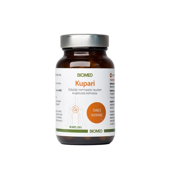 Biomed Kupari 90 kapselia on suunniteltu tukemaan immuunijärjestelmää ja edistämään terveitä luuston, nivelten ja verisuonten toimintoja. Kupari auttaa myös raudan imeytymistä ja kuljetusta elimistössä, mikä voi auttaa ehkäisemään anemiaa.