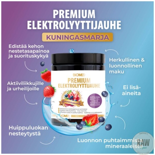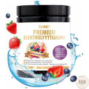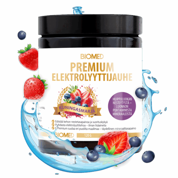 Biomed Elektrocomplex™ (Guérande merisuola, Himalajan kristallisuola, Kuolleenmeren suola, Kalaharin aavikkosuola, Korean bambusuola, Concentrace®- hivenainekompleksi, L-glysiini, magnesiummalaatti, magnesiumbisglysinaatti, kookosvesijauhe, natriumbikarbonaatti, kaliumbitartraatti, happamuudensäätöaine (omenahappo)), luontaiset aromit (mansikka, mustikka), tiiviste (bataatti, retiisi, omena,kirsikka), luontainen makeutusaine (steviasta saatavat stevioliglykosidit). (pääraaka-aineen alkuperä muu kuin EU). Sisältää mittalusikan.
