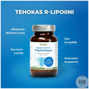 | Ainesosat | Täyteaine (mikrokiteinen selluloosa), R-alfalipoiinihappo (muu kuin EU), kapseli (gelatiini), paakkuuntumisenestoaineet (piidioksidi ja rasvahappojen magnesiumsuolat).Valmistettu Suomessa.Ilmoitettua suositeltua vuorokausiannosta ei saa ylittää. Ravintolisää ei tule käyttää monipuolisen ruokavalion korvikkeena. Tuote on säilytettävä pienten lasten ulottumattomissa. Säilytettävä kuivassa ja huoneenlämmössä. |