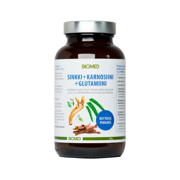 Sinkki + Karnosiini + Glutamiini -juomajauheSisältää myös Aloe Veraa sekä lakritsinjuuri-, punajalavan kuori- ja rohtosalkoruusun juuriuutteita.UUTUUS!Nopeavaikutteinen ja tehokas juomajauhe koko ruoansulatuskanavan limakalvojen kunnon tukemiseenTutkitusti tehokkaat ainesosatUudistaa, suojaa sekä rauhoittaa ruoansulatuskanavan limakalvojaEi lisäaineitaHelppokäyttöinen ja nopeavaikutteinenValmistettu suomessaSinkki + Karnosiini + Glutamiini -juomajauheesta tehtävä juoma hoitaa suun limakalvoista eteenpäin koko ruoansulatuskanavan limakalvoja aivan suoliston loppuun asti.Kaikki aineosat ovat vesiliukoisessa ja nopeasti vaikuttavassa muodossa. Itse juoman voi sekoittaa esimerkiksi lämpimään veteen, jolloin syntyy miedosti lakritsinmakuinen ja lähes väritön juoma, joka on helppo nauttia. Jauhe voidaan sekoittaa myös teehen, kahviin tai muuhun lämpimään nesteeseen.Nauti juoma rauhalliseen tahtiin, jolloin vaikutus ulottuu suun ja ruokatorven limakalvoista aina vatsalaukun ja suoliston limakalvolle asti.Tuote sisältää tehokkaan yhdistelmänL-GlutamiiniaL-KarnosiiniaSinkkisulfaattiaLakritsijuuriuutetta (DGL)Rohtosalkoruusun juuriuutettaPunajalavan kuoriuutettaKuivattua Aloe Vera mehuaSynergisesti vaikuttavat tehoaineetL-GlutamiiniSuoliston pintakerros tukeutuu glutamiiniin uuden pintasolukon rakennusaineena. Tuote sisältää laadukasta glutamiinia, joka on parhaan makuinen ja hyvin liukeneva.L-KarnosiiniKarnosiini on dipeptidi, joka muodostuu beta-alaniini- ja histidiini aminohapoista. Karnosiinia esiintyy elimistössä muun muassa sydänlihaksessa, aivoissa, ihossa, maksassa ja munuaisissa.SinkkiTuotteessa on käytetty sinkkisulfaattia, joka auttaa säätelemään hiilihydraattien aineenvaihduntaa ja näin tukee myös normaalia sokeriaineenvaihduntaa.