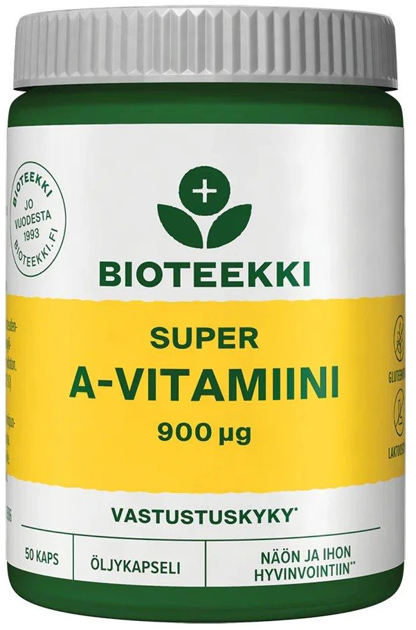 - Bioteekin Super A-vitamiini tarjoaa korkealaatuisen A-vitamiinin lähteen, joka tukee kehon normaalia toimintaa.
