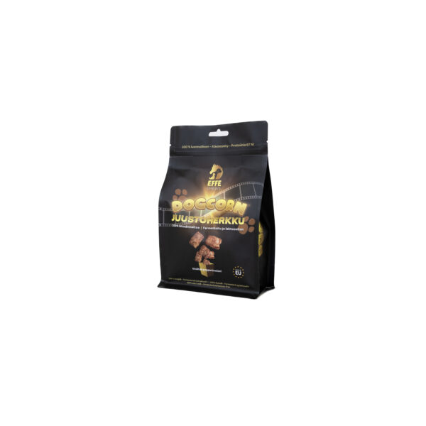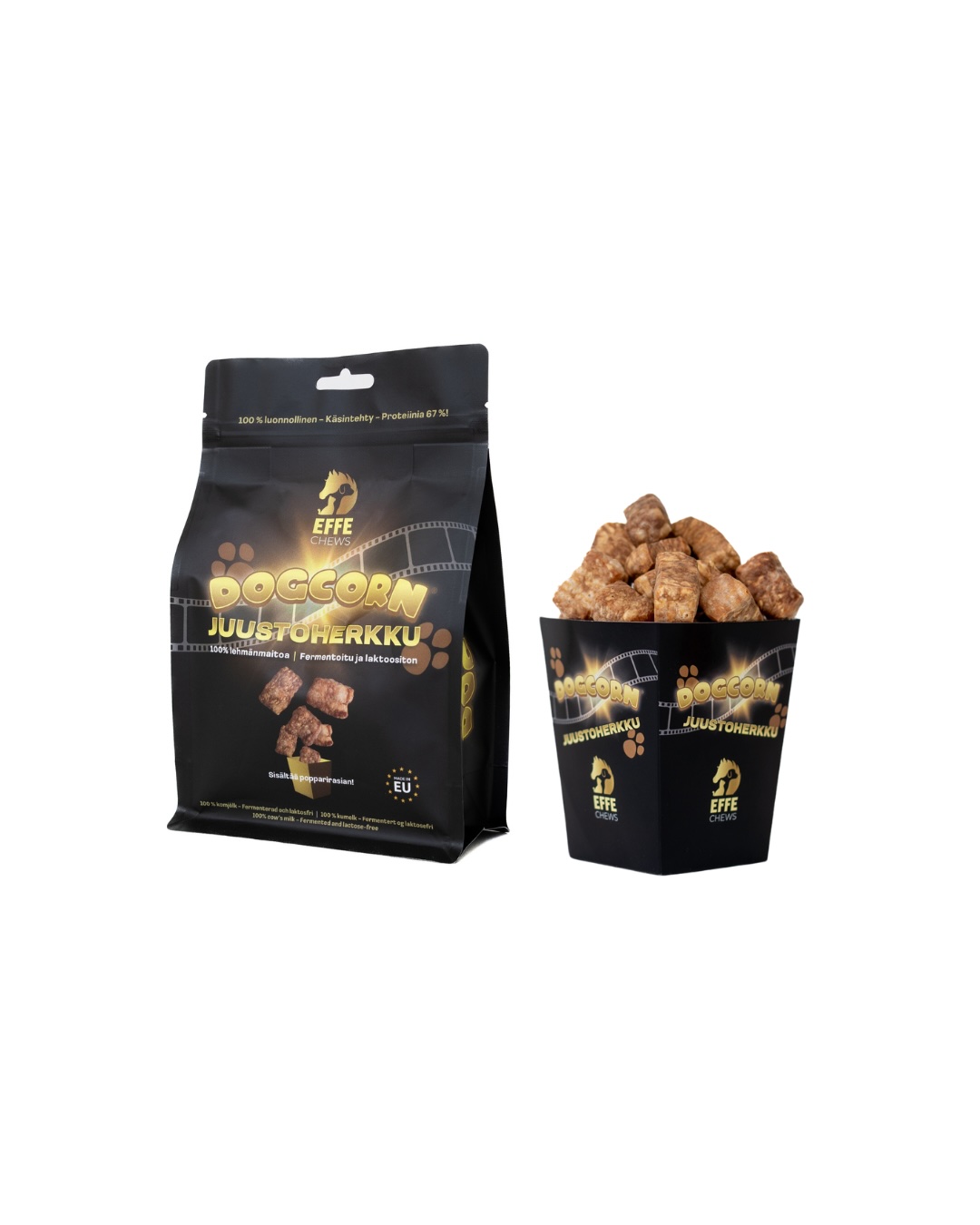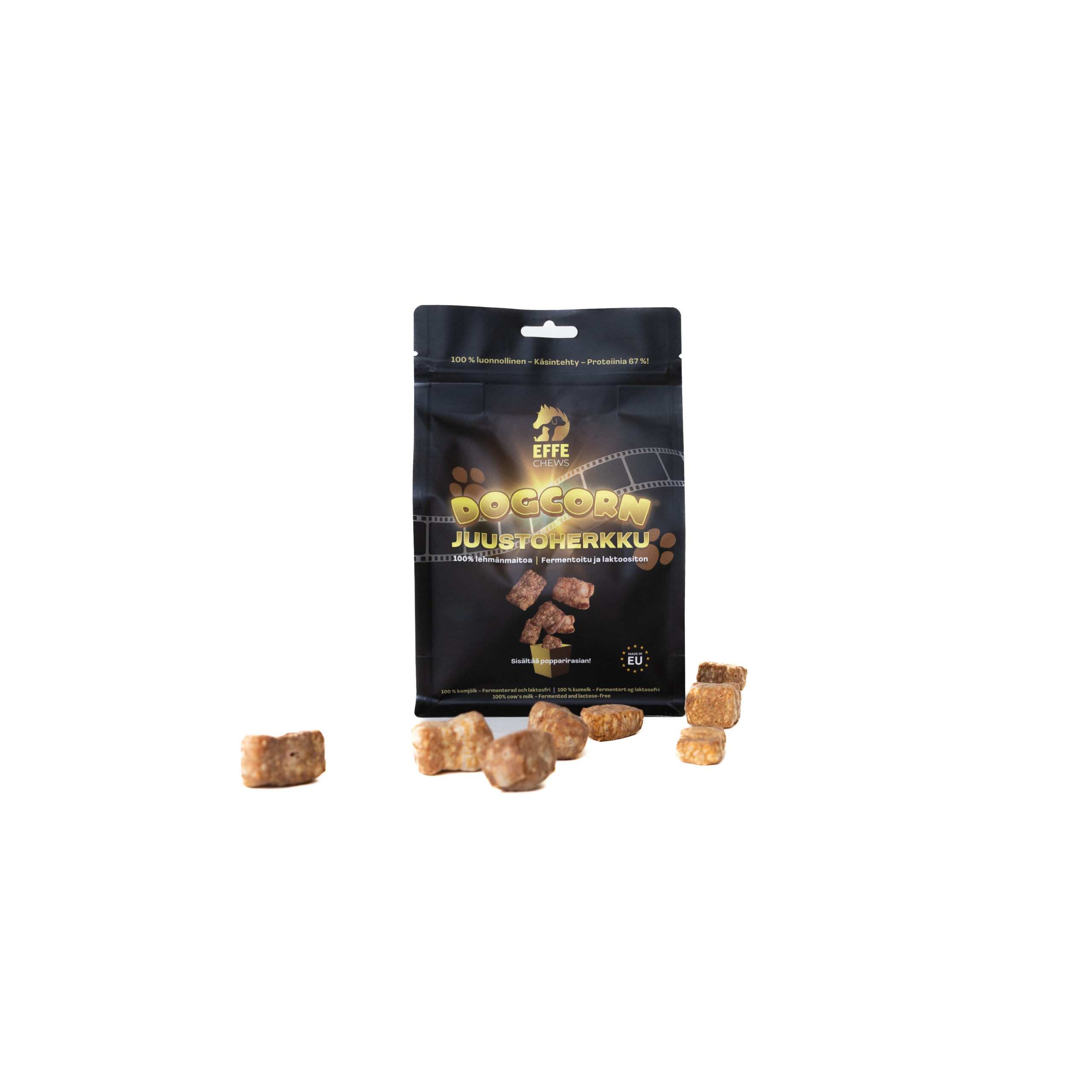 Suomessa kehitetty Dogcorn on nimensä mukaisesti koirien oma ”leffaherkku”, mutta se on myös oiva purtava arkeen ja toimii myös välipalana. Se maistuu erinomaisesti koirille ja on vieläpä terveellinen, luonnollinen sekä käsintehty. Juustoherkku on pehmeämpi ja huokoisempi kuin muut koiranpuruluut, joten se sopii erityisesti pennuille ja vanhemmille koirille.