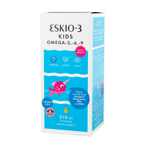 Lasten oma monipuolinen kalaöljyvalmiste Eskio-3 Kids on koostumukseltaan luonnollinen ja sisältää runsaasti omega-3-, omega-6- (GLA) ja omega-9-rasvahappoja sekä D-vitamiinia. Makuna tuttifrutti. 3-12 –vuotiaille lapsille. Friend of The Sea –sertifioitu ja täyttää ympäristöystävällisten kalastus- ja tuotantomenetelmien vaatimukset. Ravintolisä ei korvaa monipuolista ja tasapainoista ruokavaliota eikä terveitä elämäntapoja.