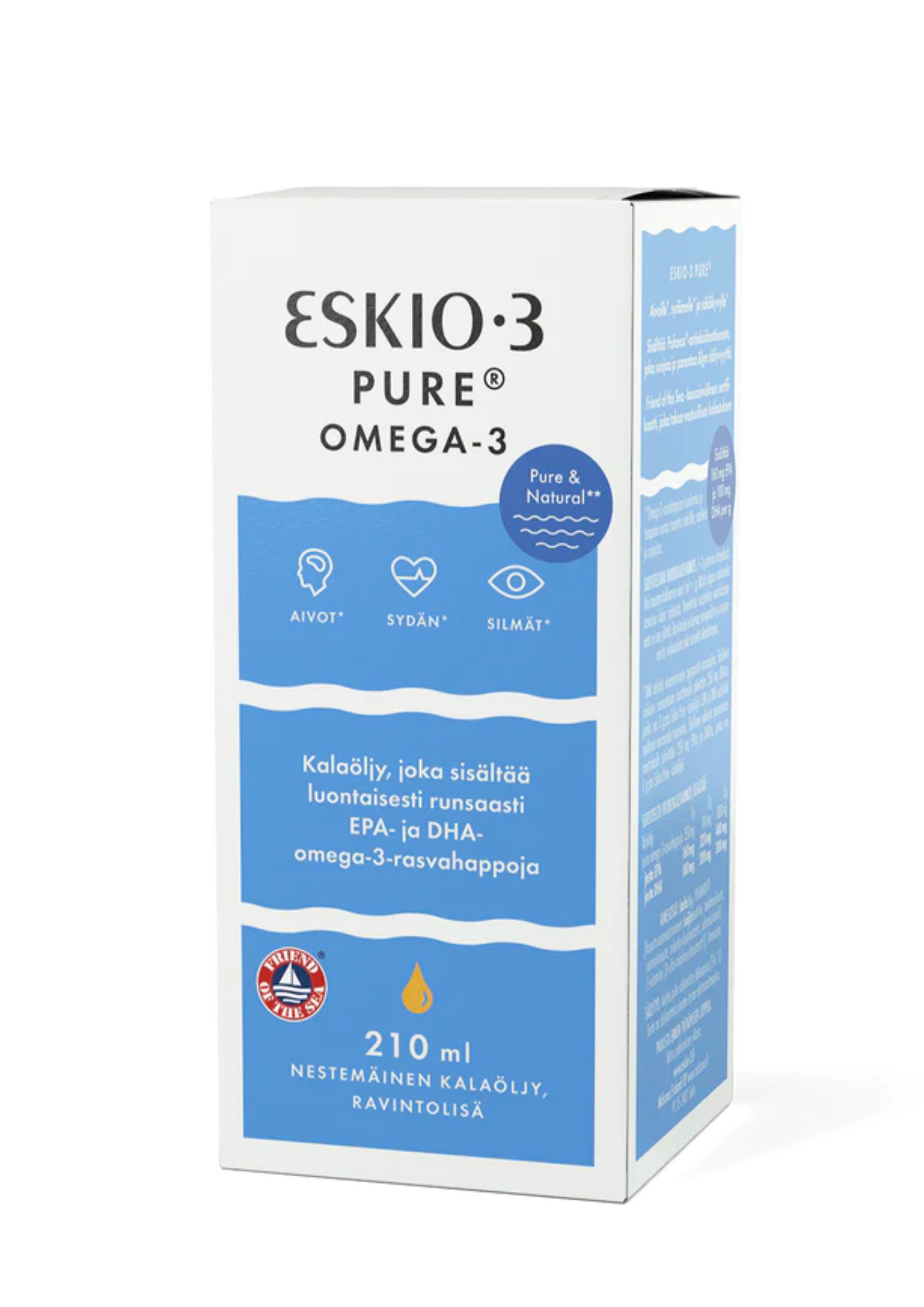 Eskio-3 Pure nestemäinen kalaöljy on neutraalin makuinen runsaasti omega-3 -rasvahappoja sisältävä kalaöljy. Nestemäinen Pure kalaöljy on Friend of the Sea -sertifioitu. Ravintolisä.