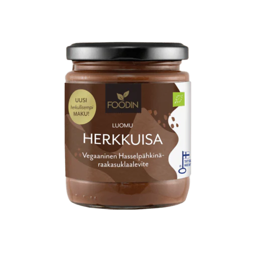 Foodin luomu Sokeroimaton Hasselpähkinä-raakasuklaalevite Herkkuisa 230 g on pehmeän täyteläinen ja intensiivisen makuinen levite, joka on suunniteltu aitoja raaka-aineita arvostaville herkuttelijoille. Sen makumaailmassa yhdistyvät paahteinen hasselpähkinä ja syvä, aromikas raakasuklaa, luoden tasapainoisen ja koukuttavan kokonaisuuden ilman lisättyä sokeria.