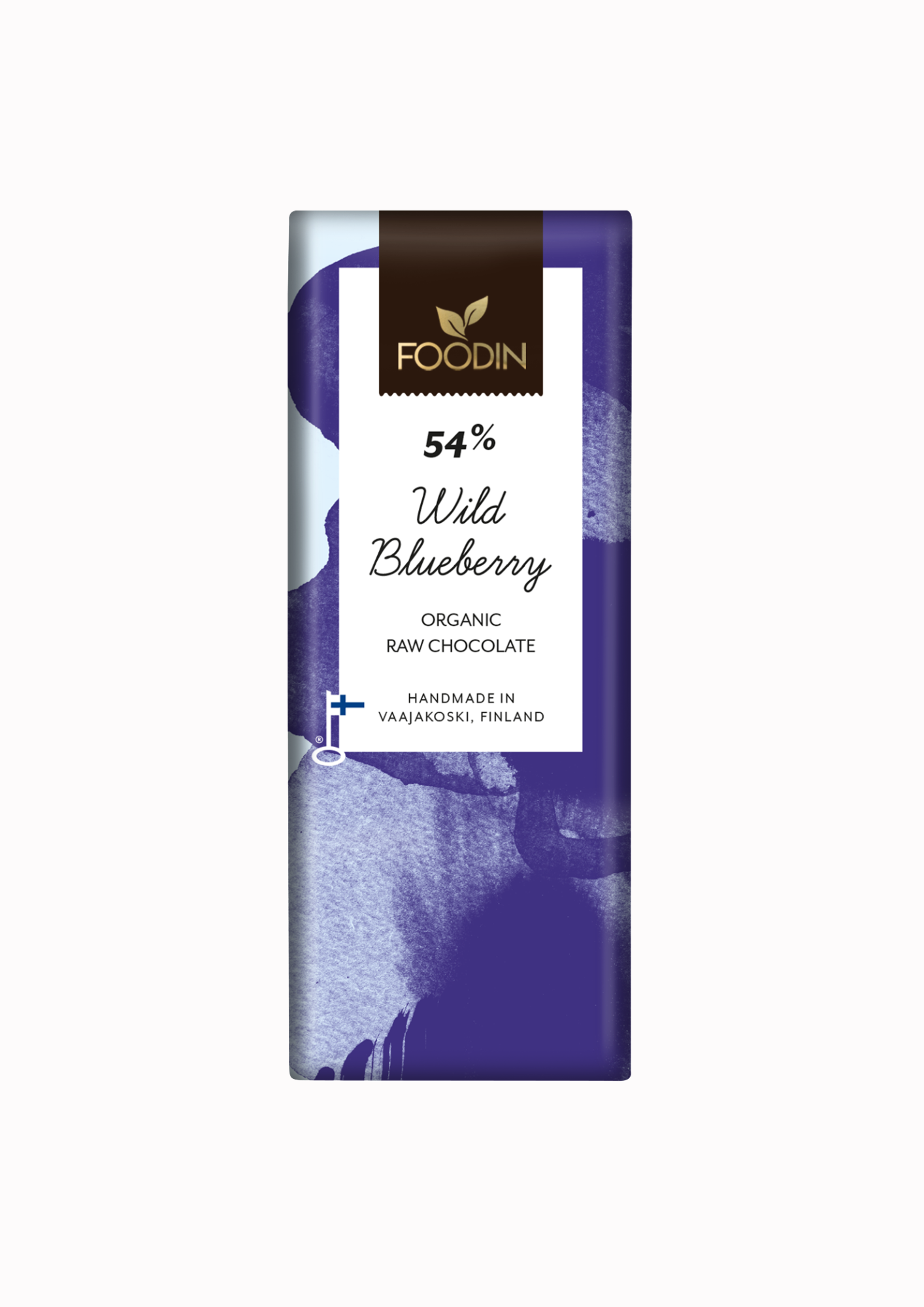 Foodin Raakasuklaa Wild Blueberry 54 % luomu 40 g yhdistää laadukkaan raakasuklaan ja pohjoisen luonnon inspiroiman villimustikan ainutlaatuisella tavalla. Suklaan pehmeä ja hieman makea tummuus toimii täydellisenä pohjana marjaiselle aromille, joka tuo makuun raikkautta, keveyttä ja luonnollista hedelmäisyyttä.