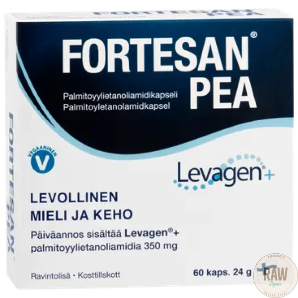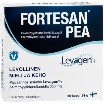 Fortesan® PEA ravintolisä sisältää patentoitua Levagen®+ palmitoyylietanoliamidia. Se on rasvahappoamidi, jota keho tuottaa itse esimerkiksi urheillessa, tukien samalla suorituksesta palautumista. Rentouttaa ja vaikuttaa positiivisesti unen laatuun. Ei sisällä eläinperäisiä ainesosia. Valmistettu Suomessa. Ravintolisä ei korvaa monipuolista ja tasapainoista ruokavaliota eikä terveitä elämäntapoja. Ei raskaana oleville, imettäville tai kasvuikäisille.