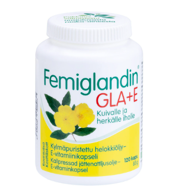 - Femiglandin® GLA+E -kapselit sisältävät monityydyttymättömiä rasvahappoja eli F-vitamiinia sekä E-vitamiinia.