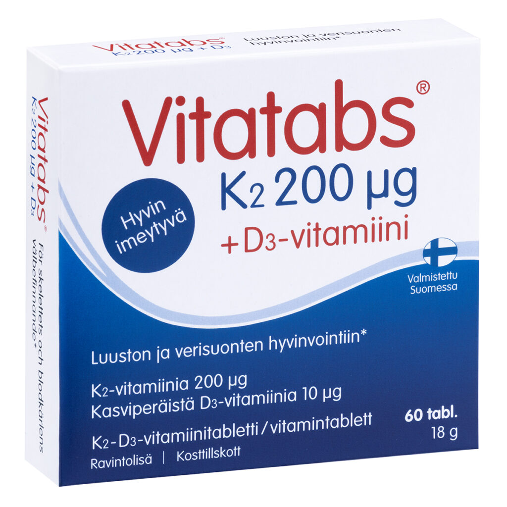- Vitatabs® K2+D3 sisältää VitaMK® K2-vitamiinia eli menakinonia. Hyvin imeytyvä K2-vitamiini tukee luuston hyvinvointia auttamalla kalkkia kiinnittymään oikeaan paikkaan eli luustoon, jolloin kalkki ei jää kiertelemään verisuonistoon. Vitatabs® K2+D3 sisältävät myös kasviperäistä D3-vitamiinia, joka vielä tehostaa kalkin imeytymistä luukudokseen. Tuote sopii kaikille, jotka haluavat huolehtia verisuontensa terveydestä sekä luustonsa hyvinvoinnista.