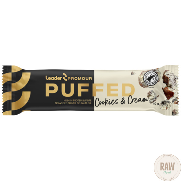 Promour Puffed Cookies & Cream on keksin ja kermanmakuinen proteiinipatukka rapealla riisipuffilla, kuorrutettuna maitosuklaalla. Patukka sisältää runsaasti proteiinia ja kuitua eikä yhtään lisättyä sokeria tai palmuöljyä. Se sopii sekä terveelliseksi välipalaksi että herkutteluun vaikkapa kahvikupin ääressä.
