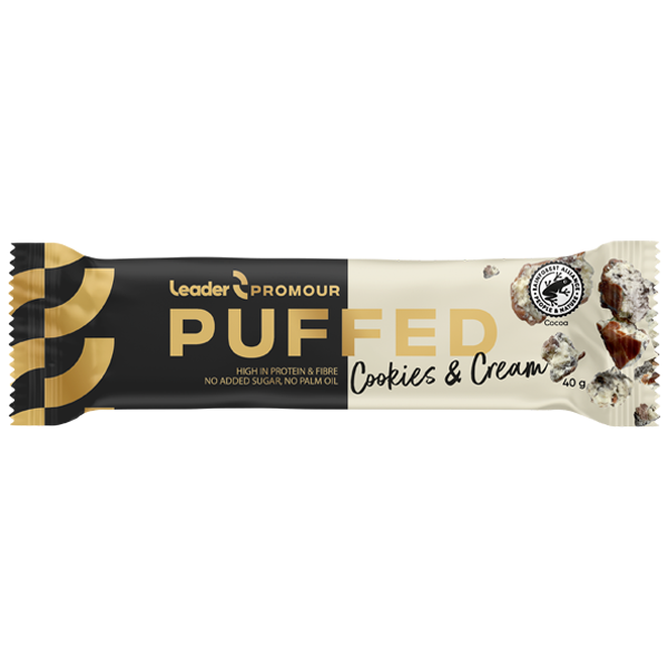 Promour Puffed Cookies & Cream on keksin ja kermanmakuinen proteiinipatukka rapealla riisipuffilla, kuorrutettuna maitosuklaalla.