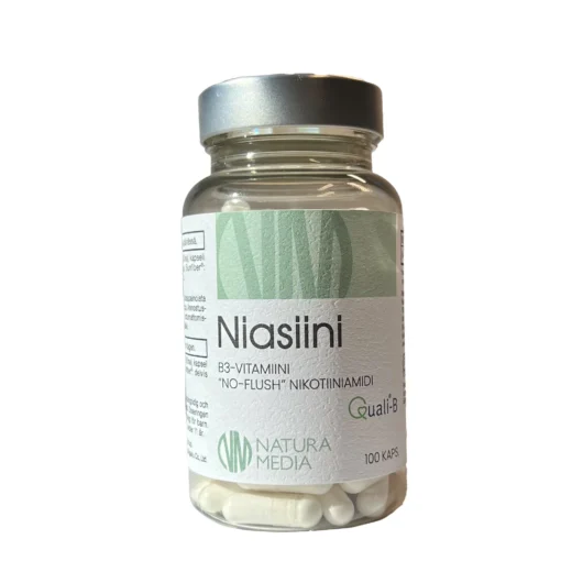 Natura Media Niasiini B3-vitamiini on korkealaatuinen ravintolisä, joka tarjoaa tehokkaan ja helposti imeytyvän annoksen niasiinia (B3-vitamiinia). Jokainen kapseli sisältää 250 mg niasiinia, joka tukee monipuolisesti kehon normaaleja toimintoja ja hyvinvointia.