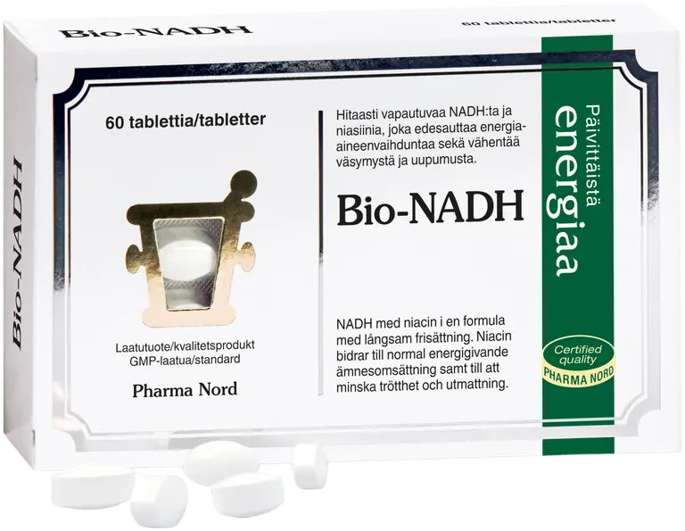 Bio-NADH on ravintolisä. Yksi tabletti sisältää 250 mg NADH:n esiastetta niasiinia ja 2 mg NADH:ta. Suositeltava vuorokausiannos on 2-3 tablettia niin, että ensimmäisen viikon aikana 1 tabletti 2 kertaa päivässä ja sen jälkeen 3 tablettia päivässä. Pharma Nord on kehittänyt koostumuksen tieteellisen tutkimuksen pohjalta. Erityisen matriisin ansiosta sen vaikuttavat aineet liukenevat hitaasti, joten ne vapautuvat vasta suolistossa ja säilyvät näin ollen suojassa mahahapoilta.