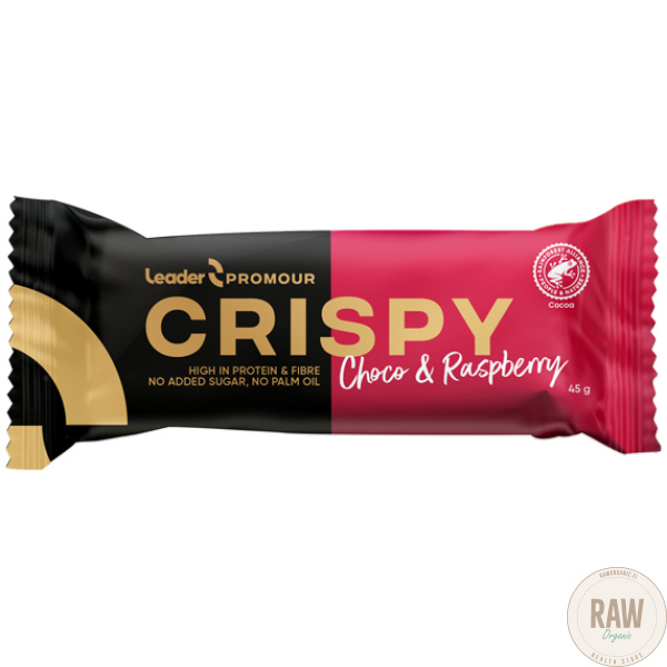 Päältä rapea ja sisältä pehmeä Leader Promour Crispy -proteiinipatukka on vastustamaton välipala, joka sisältää runsaasti proteiinia ja ravintokuitua. Pinnalla aitoa suklaata ja sisällä pirteä vadelman makuinen täyte