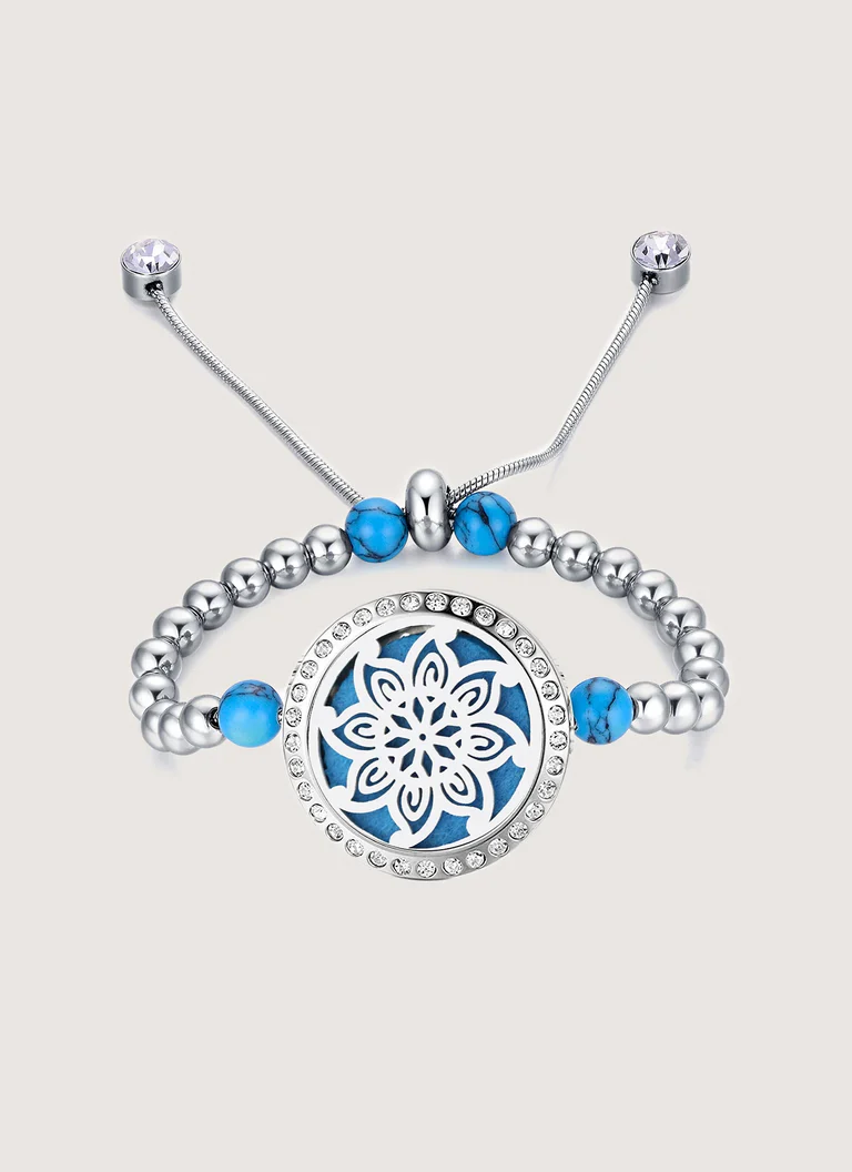 Nauti inspiroivista eteerisistä öljyistä missä ikinä oletkin! Kaunis aromaterapia rannekoru kuljettaa mukanasi mieleistäsi tuoksua. Annostele eteeristä öljyä mukana tulevaan huopatyynyyn ja aseta se rannekorun sisään. Valitse mukaasi tilanteeseen sopiva eteerinen öljy tukemaan mielialaasi. Laadukas rannekoru on valmistettu ruostumattomasta teräksestä. Pakkaus sisältää 5 eriväristä huopatyynyä.
