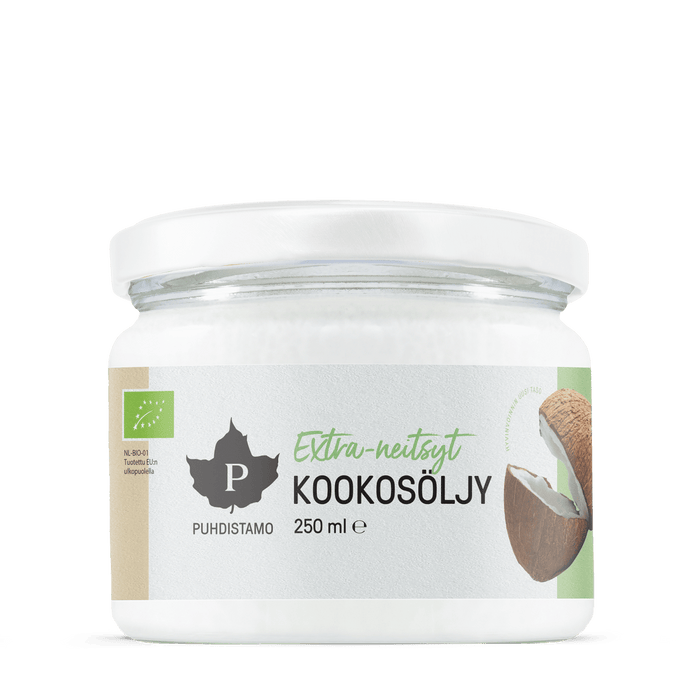 Puhdistamon Extra-neitsytkookosöljyssä maistat taatusti laadun! Luomulaatuisen kookosöljymme poikkeuksellisen raikas maku saavutetaan, kun kookospähkinän hedelmälihaa puristetaan hellävaraisesti mekaanisella kylmämenetelmällä. Hellävarainen valmistusmenetelmä takaa sen, että kookosöljyn luonnolliset ravintoaineet sekä aromit säilyvät parhaalla mahdollisella tavalla.