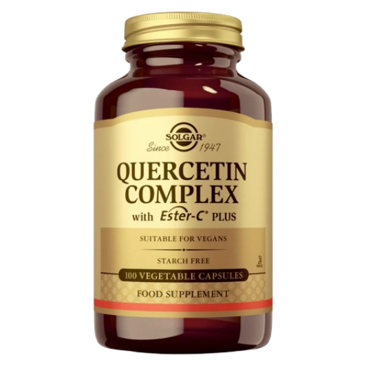 Solgar® Kversetiini Complex sisältää bioflavonoidi kversetiiniä, vatsaystävällistä Ester C® -vitamiinia, bromelaiinia, acerolaa, ruusunmarjaa, sitrusbioflavonoideja ja rutiinia.