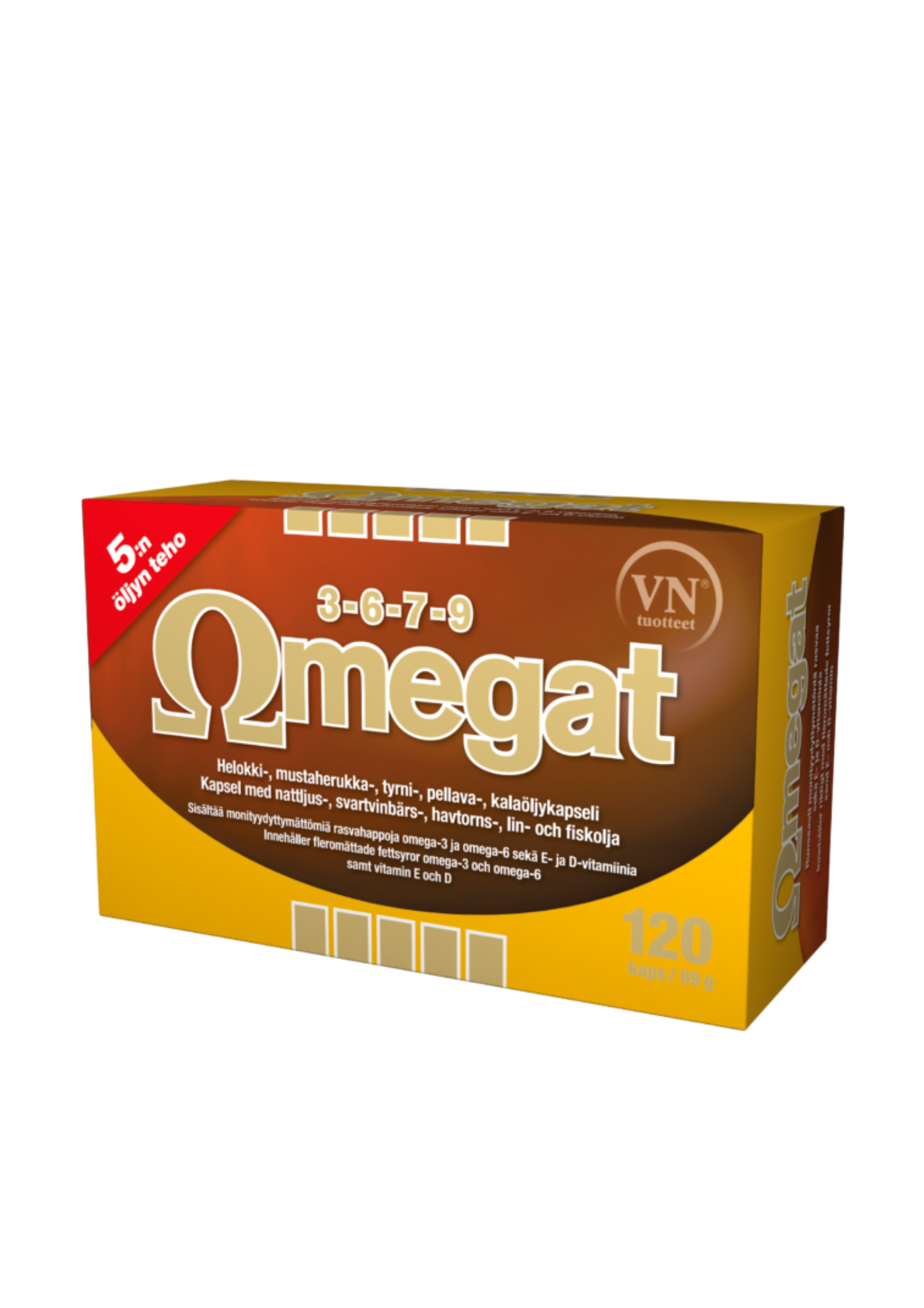 Omegat 3-6-7-9 kapselit sisältävät kaikkia elimistön hyvinvoinnille välttämättömiä omega-3-, omega-6-, omega-7- ja omega-9-rasvahappoja. Kalaöljyssä ja neljässä eri siemenöljyssä on ihanteellinen rasvahappojen suhde.