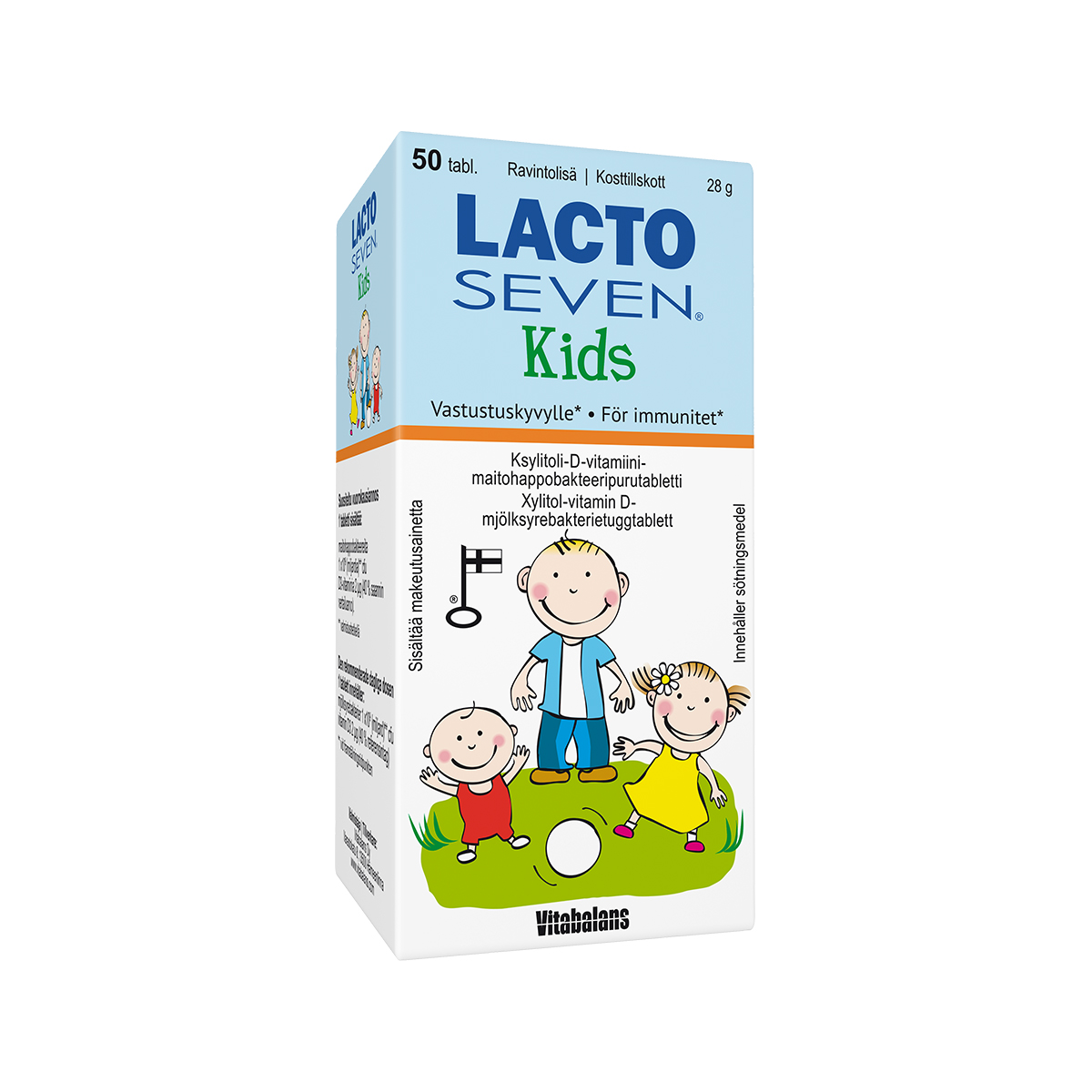 Lacto Seven Kids-purutabletit sopivat yli 3-vuotiaille lapsille. Tabletissa on myös D3-vitamiinia, joka edistää immuunijärjestelmän (vastustuskykyä) normaali toimintaa. Ksylitolia sisältävän tabletin voi antaa lapselle päivittäin esimerkiksi aterioiden jälkeen.